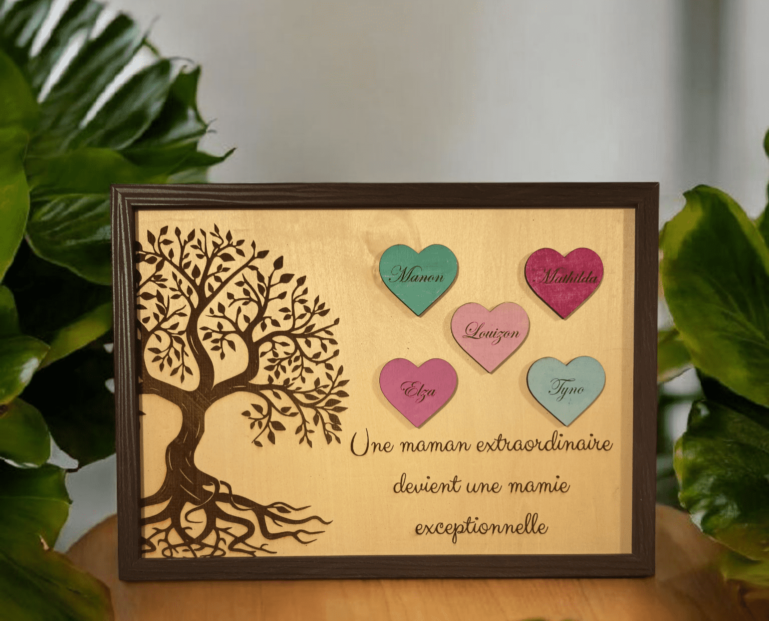 Ne manquez pas l'opportunité de créer un cadeau qui touchera le cœur de votre mamie. Avec le cadre mamie coeurs, chaque photo devient une œuvre d'art, chaque prénom une histoire d'amour. Commandez dès aujourd'hui et donnez vie à des souvenirs inoubliables !