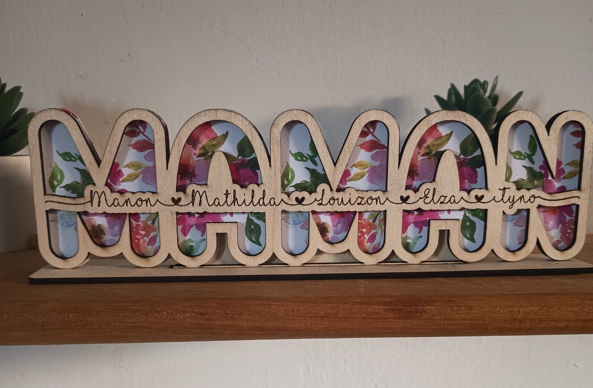 Mot maman en bois, fond fleuri et prénoms des enfants.