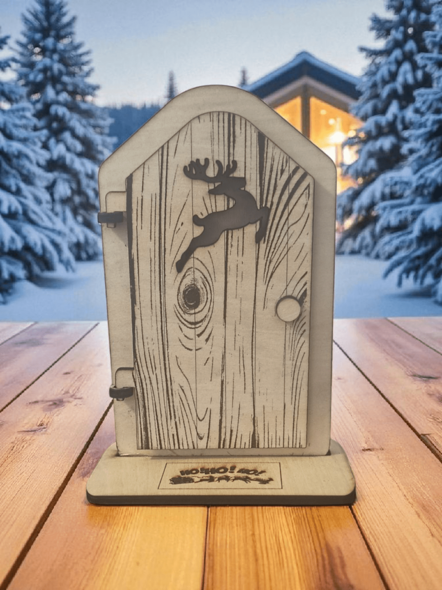 La porte est sur socle, s'ouvre pour laisser apparaître un paysage avec bonhomme de neige.